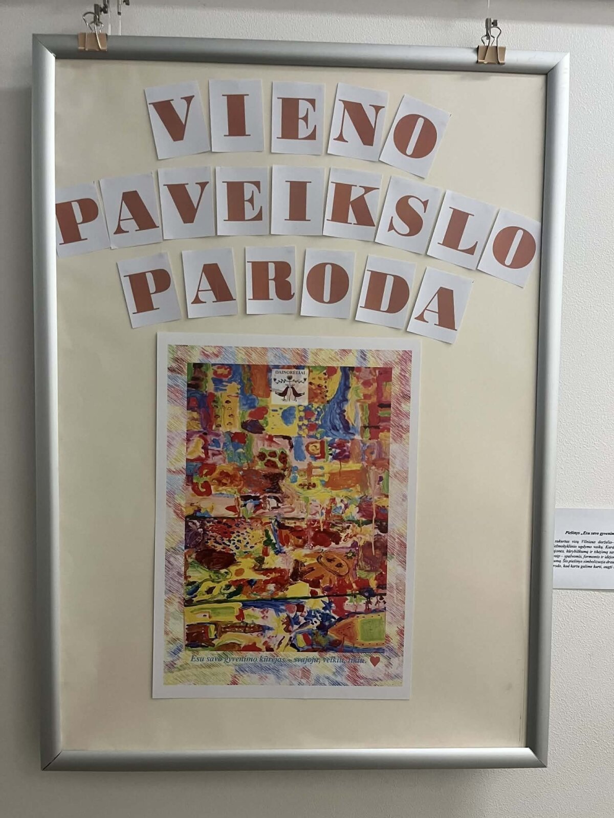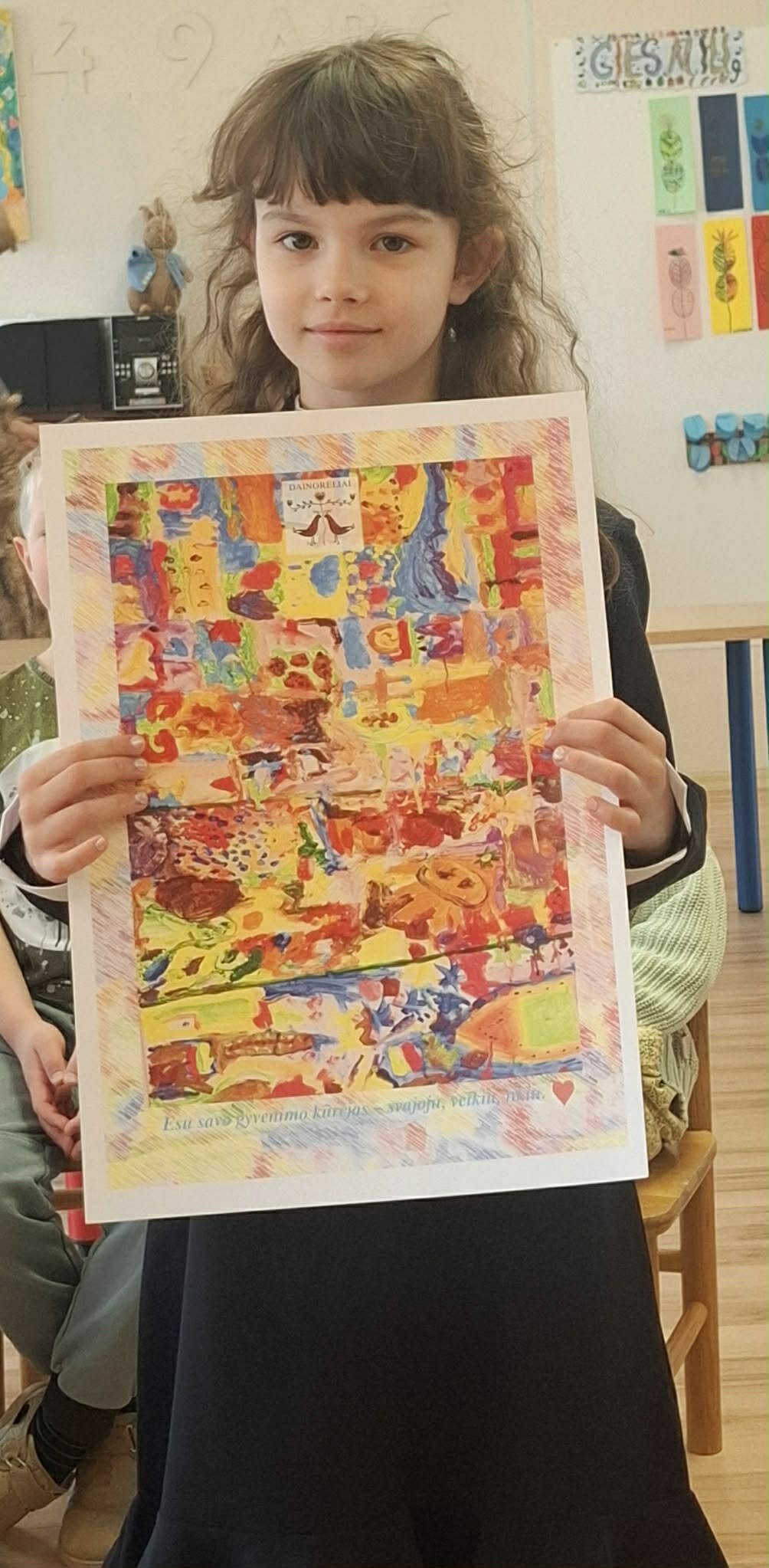 Piešinys „Esu savo gyvenimo kūrėjas – svajoju, veikiu, kuriu“ sukurtas visų Vilniaus darželio-mokyklos „Dainorėliai“ ikimokyklinio ir priešmokyklinio ugdymo vaikų. Kurdami šį bendrą darbą, vaikai išreiškė savo svajones, kūrybiškumą ir tikėjimą savimi. Kiekvienas mažasis kūrėjas prisidėjo savaip – spalvomis, formomis, idėjomis, kurios susijungė į vieningą, prasmingą visumą. Šis piešinys simbolizuoja draugystę, bendrystę ir pasitikėjimą vienų kitais, parodo, kad kartu galime kurti, augti ir įgyvendinti savo svajones.
