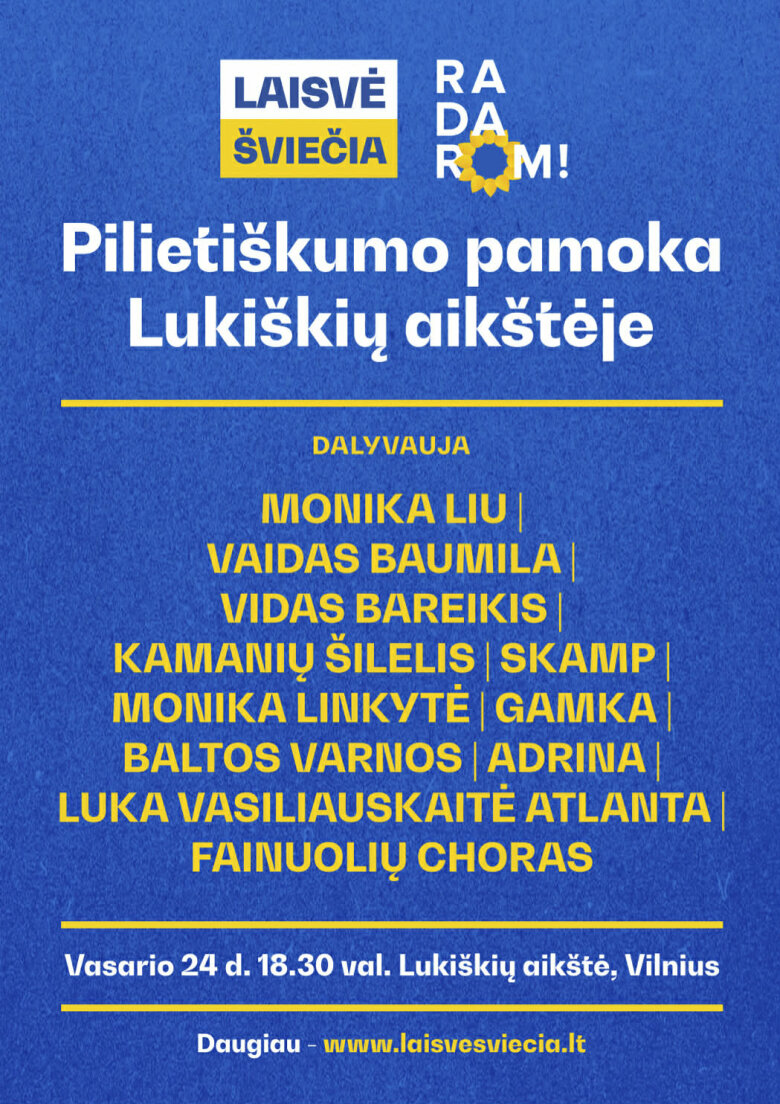 Gerb. "Dainorėlių" bendruomene, maloniai kviečiame Visus į solidarumo su Ukraina akciją „Laisvė šviečia 2026. Radarom“, kuri vyks š. m. vasario 24 d. 18.30 val. Vilniuje, Lukiškių aikštėje. Renginio programoje – garsių šalies atlikėjų pasirodymai bei visuomenės veikėjų įžvalgos apie laisvę ir nepriklausomybę. Į aikštę atkeliauti rekomenduojame su Lietuvos ir Ukrainos vėliavomis ir solidarumo transparantais. Visa informacija skelbiama www.laisvesviecia.lt. Renginys nuo 19.00 val. bus transliuojamas per LRT.